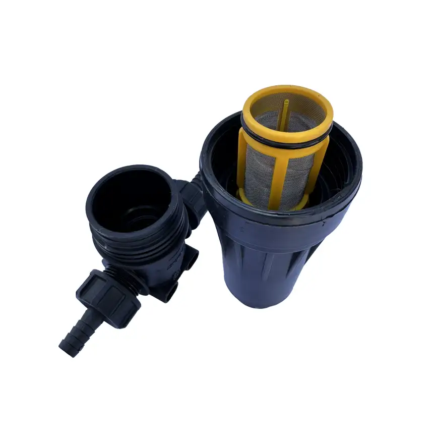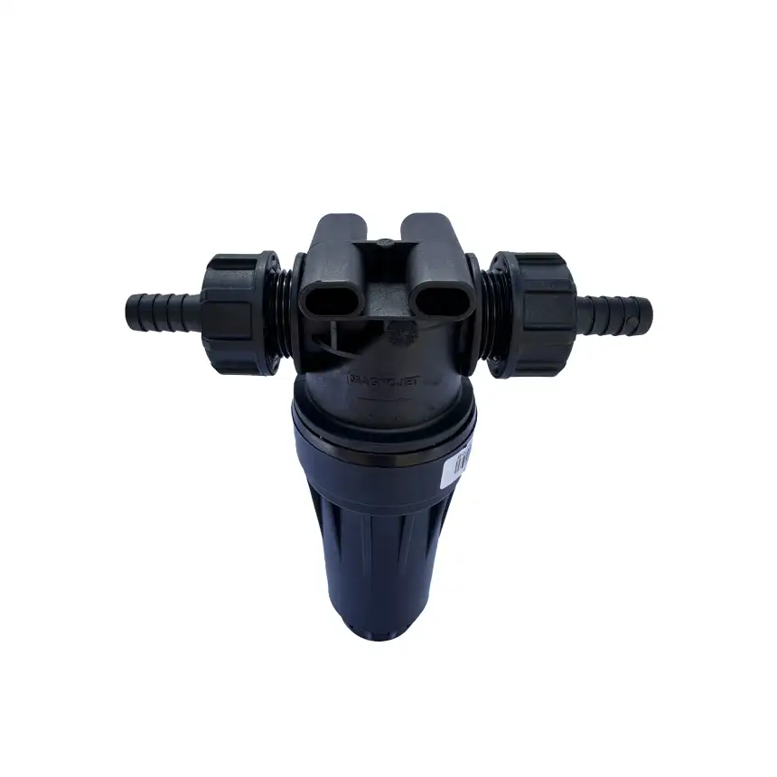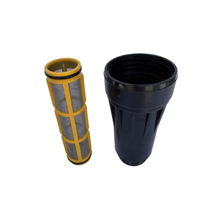 Filtro de linha copo longo, corpo em nylon com fibra, pressão max. 200 LBF/POL2 e capacidade de filtragem de 150 L/MIN, acompanha elemento filtrante malha 80 e saídas para mangueira de ½"